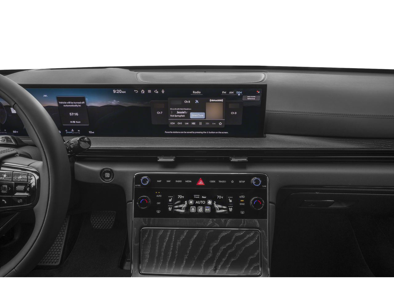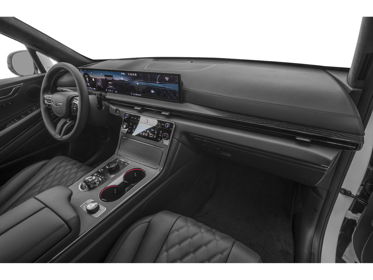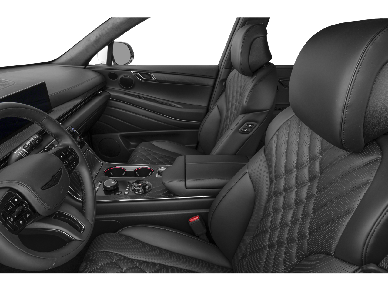 - Radio: AM/FM/HD Bang & Olufsen Sound System -inc: 1400 watts, 18 speakers, 14 channel amplifier, 27" integrated OLED instrument cluster and navigation system, SiriusXM Radio w/90-day subscription (not available in AK or HI), cloud connected platform (cloud profiles, connected routing, dynamic voice recognition, OTA updates), wireless Apple CarPlay, wireless Android Auto, Bluetooth hands-free phone system w/audio streaming, wireless phone charger, Wi-Fi hotspot, steering wheel controls, USB, Genesis Connected Services, black anodized aluminum speaker grilles and Prestige Black-exclusive infotainment welcome screen/theme